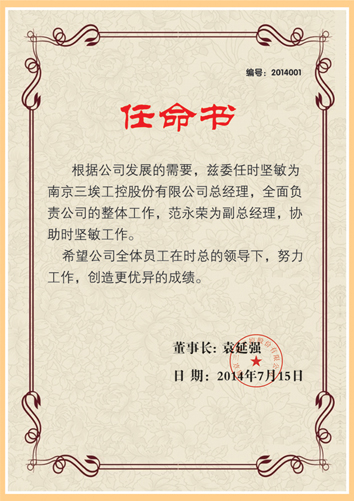 2014年7月15日,南京三埃工控股份有限公司董事长袁延强先生正式宣布,任命时坚敏同志为公司总经理,范永荣同志为公司副总经理。
