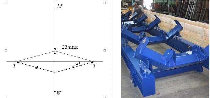 皮带具有足够的切向张力T是输送机正常运行所必需的,然而皮带不仅会将物料及其自身重力M传递给称重托辊使之下沉,其自身还会在相邻托辊间距内产生下垂,使皮带与水平方向形成夹角α,于是在皮带的法向产生分力2T•sinα,这一使称重传感器测到的力变为W =M -2T•sinα,而不等于M。