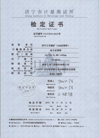 2014年11月12日济宁市测试所对该秤进行实物检定,以该矿的一台刚刚通过铁路轨道衡检定站检定的轨道衡作为控制衡器进行检定。前后共进行了3次实物检定,其准确度误差均优于0.2%。