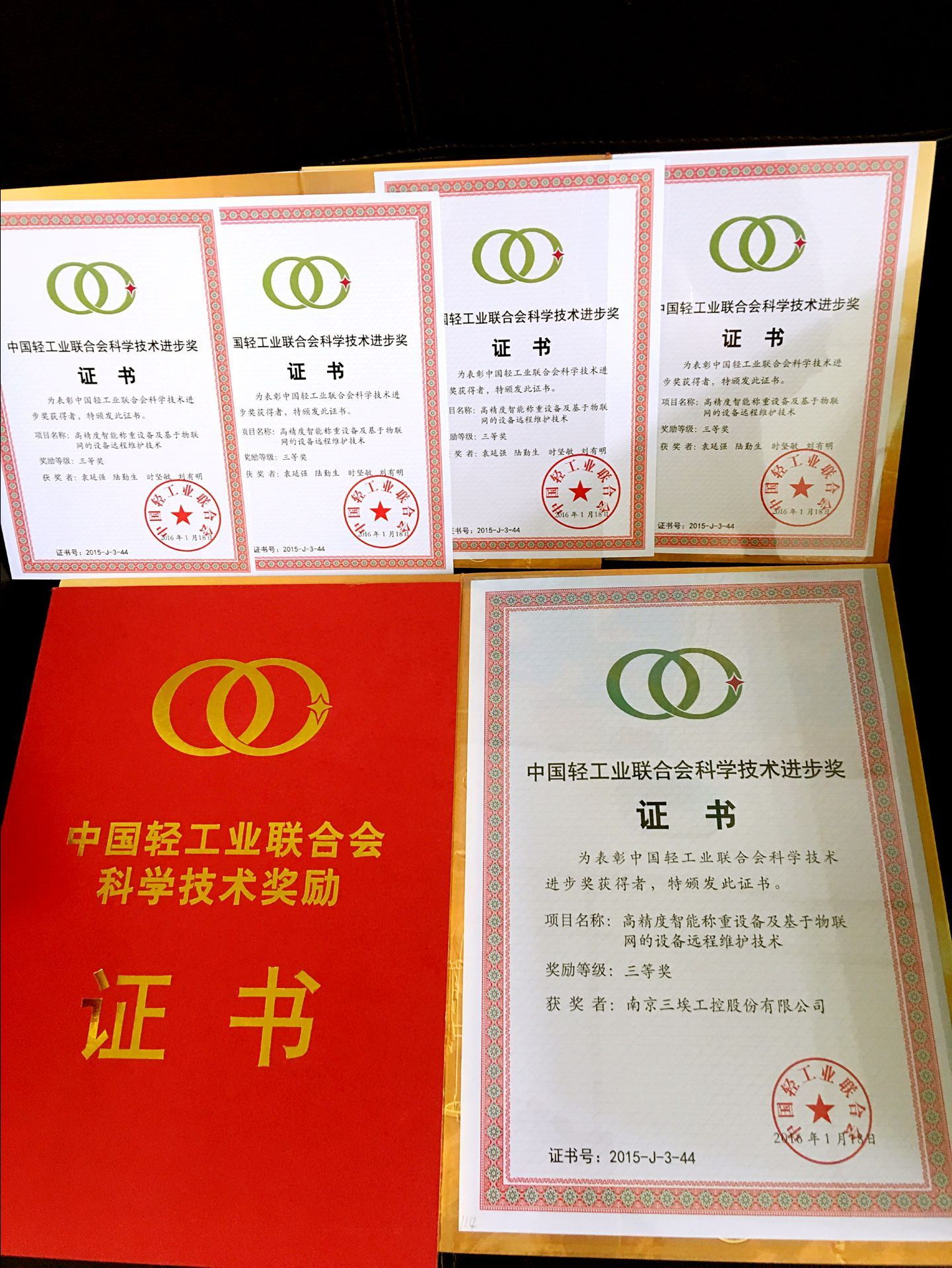 2016年6月,中国轻工业联合会第四次会员代表大会在北京召开,南京三埃工控有限公司研发的“高精度智能称重设备及基于物联网的设备远程维护技术”项目荣获三等奖,该项目基于物联网的称重系统设备远程维护技术、称重系统设备参数系统化综合补偿器技术、称重系统设备温度环境仿真试验技术、基于“多模同步采集”技术的动态“多模信号同步采集、处理”系统、全息数据库与全息数据诊断系统、单点悬浮式称重技术、基于“内力理论”的阵列式称重技术、状态跟踪补偿技术、面向皮带秤动态全性能试验的试验方法及试验平台9项技术,实现了基于PELM的阵列式皮带秤称重误差补偿,大大减少了修正时间提高了称重精度,再一次引领行业技术发展。