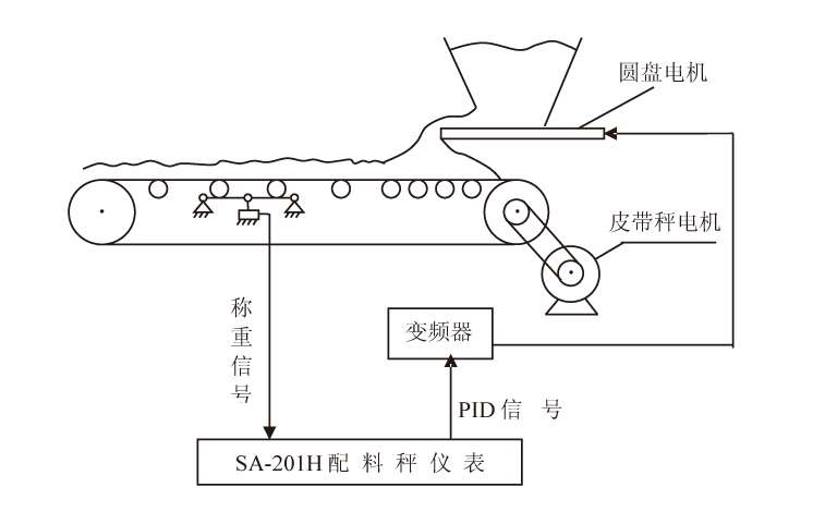 配料秤采用整机型秤架,物料自尾部受料段落下,在皮带运行下通过秤体的称重段,称重传感器和测速传感器分别测出物料的瞬时重量和运行速度,送往称重控制器(SA201、SA500)进行处理,得到物料的瞬时流量,并经过软件计算后输出PID控制信号,控制给料设备,使物料的流量达到设定的要求。